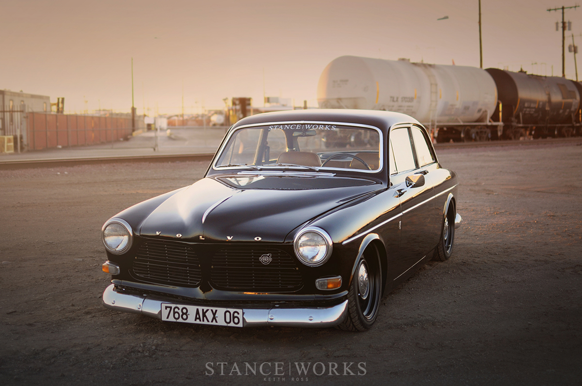 Keith Ross transformed his worn 1966 Volvo Amazon into an elegant classic with a modern twist. Boasting a sleek black paint job and glossy chrome accents, it rides low on 17-inch Mopar steelies and features a custom air ride setup. The interior exudes class with newly upholstered peanut butter leather seats.