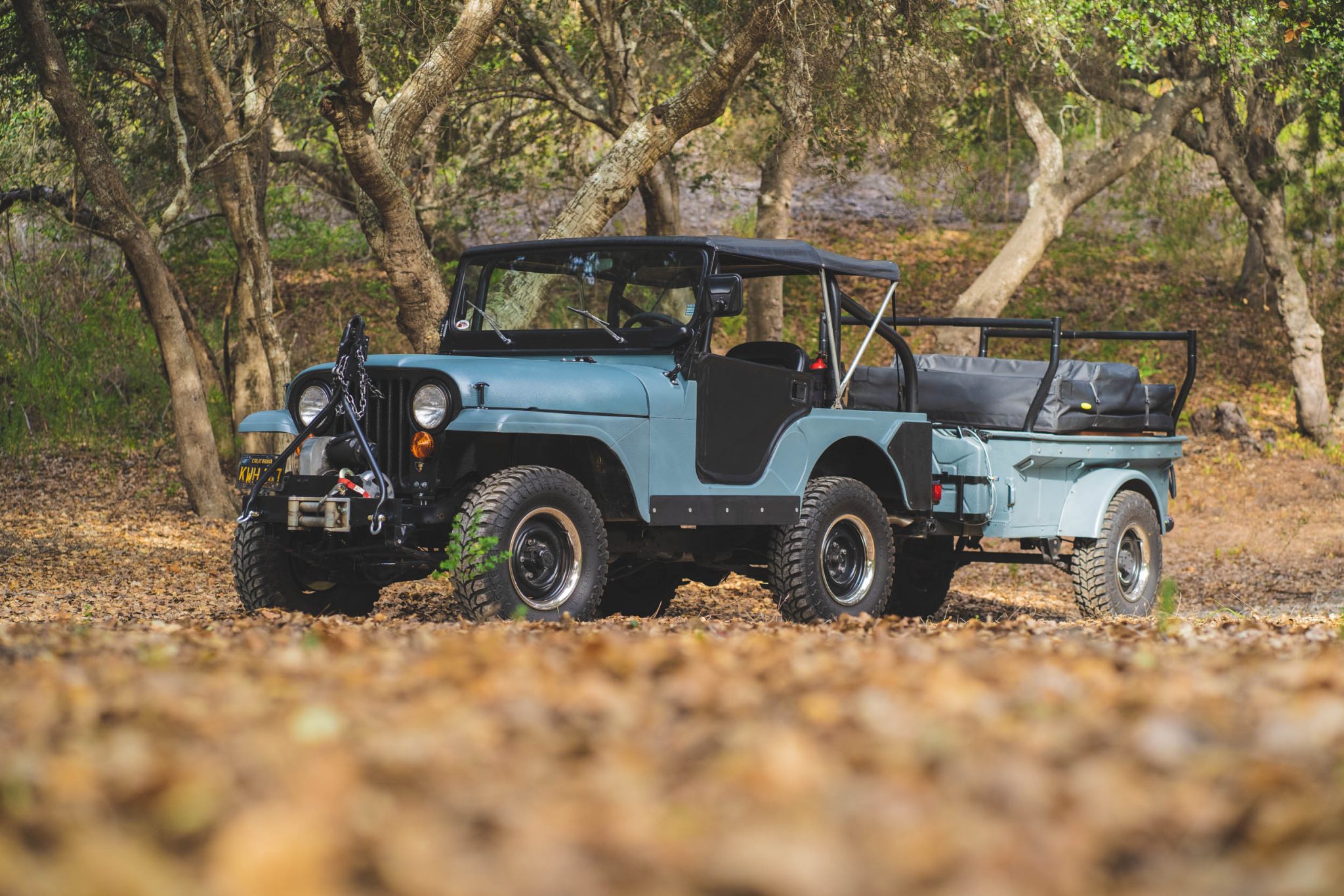 This 1952 Willys M38A1, refinished in blue bedliner material, features a Ford 302ci V8 engine and is paired with a T18 four-speed manual transmission. It includes a roll cage, winch, and distinct black-finished 15-inch steel wheels. Accompanying the truck is a modified Dunbar Kapple M-100 trailer equipped with a Smittybilt pop-up tent.